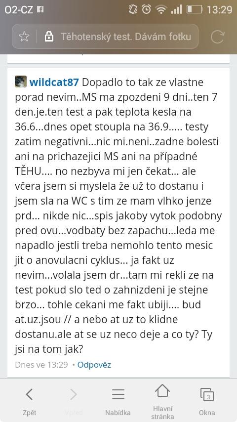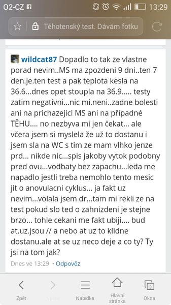 Dopadlo to tak ze vlastne porad nevim..MS ma zpozdeni 9 dni..ten 7 den.je.ten test a pak teplota kesla na 36.6...dnes opet stoupla na 36.9..... testy zatim negativni...nic mi.neni..zadne bolesti ani na prichazejici MS ani na případné TĚHU.... no nezbyva mi jen čekat... ale včera jsem si myslela že už to dostanu i jsem sla na WC s tim ze mam vlhko jenze prd... nikde nic...spis jakoby vytok podobny pred ovu...vodbaty bez zapachu...leda me napadlo jestli treba nemohlo tento mesic jit o anovulacni cyklus... ja fakt uz nevim...volala jsem dr...tam mi rekli ze na test pokud slo ted o zahnizdeni je stejne brzo... tohle cekani me fakt ubiji.... bud at.uz.jsou // a nebo at uz to klidne dostanu.ale at se uz neco deje a co ty? Ty jsi na tom jak?