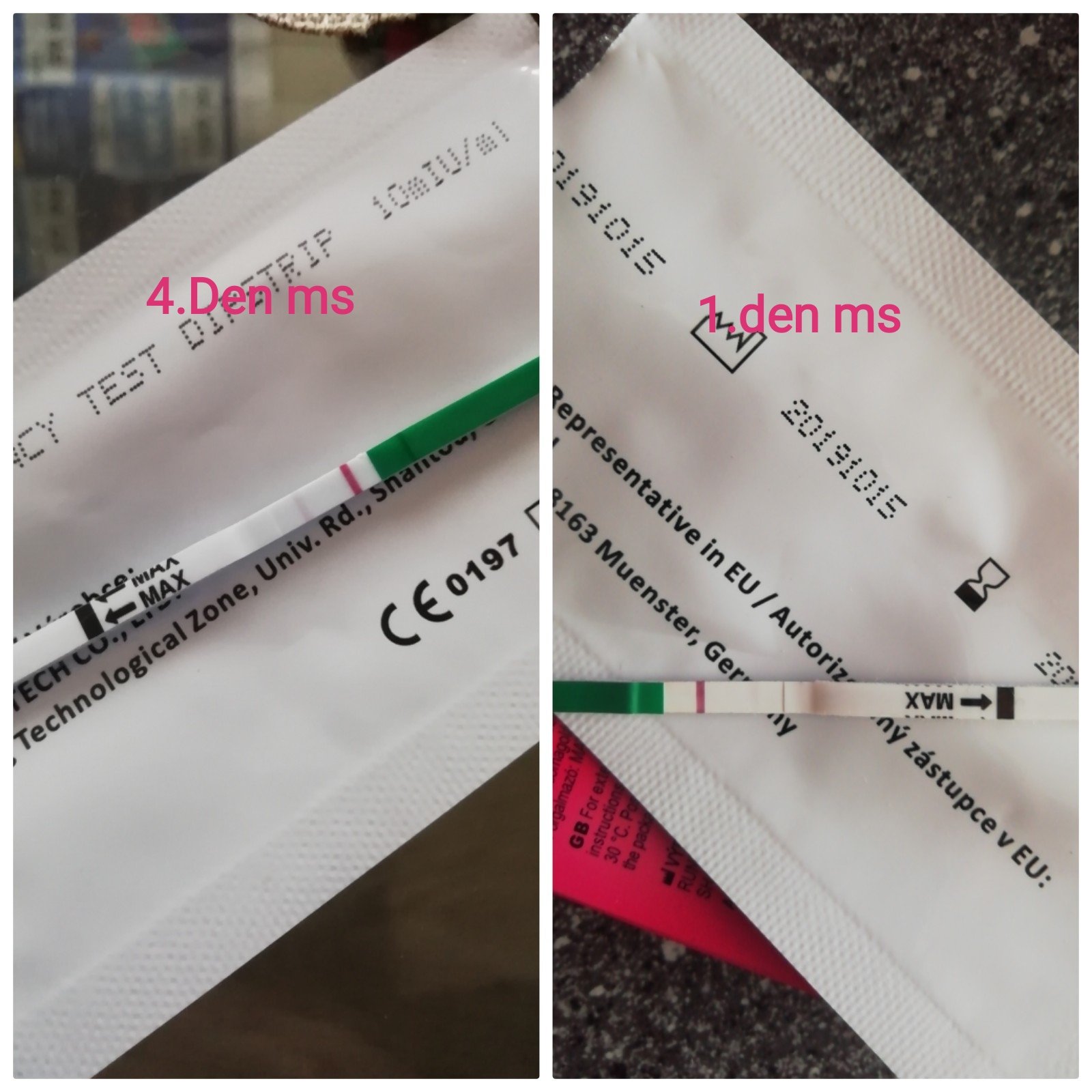 Zdravím holky, jeden dělaný v den očekávané ms a druhý dělaný dnes ráno, což je 4 den co ms nepřišla. Zdá se mi zeztest zesílil ale přijde mi čárka pořád slabá, co myslíte? Pořád mam strach že se ms dostaví, včera rano jsem dokonce trošku hnědě špinila, od té doby nic. Test je pepino 10…předem děkuji za odpověďi