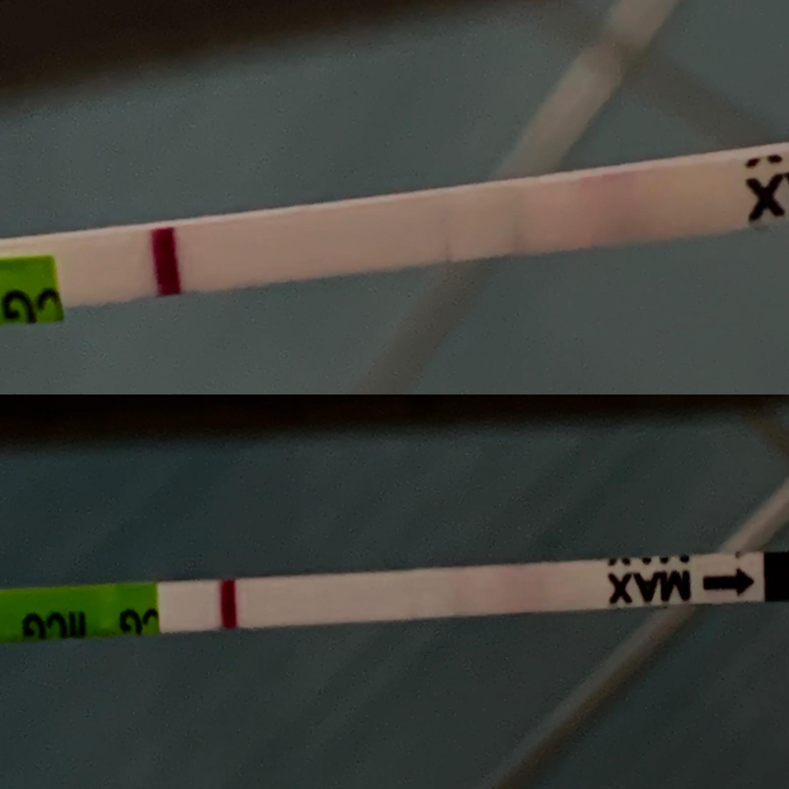 Ruzovy flek v oblasti,kde se test namaci bych neresila,na spodnim testu vidim naznak carky/rysky…