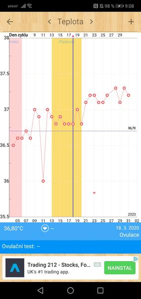 @lenickamimi Myslím, že je to tam vyznačené správně. Odhadla jsem špatně to datum z předchozího obrázku, pořádně jsem to neviděla. Ale toto sedí. Ovulace byla nejspíš toho 19., to je poslední den nízkých teplot.