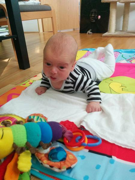 Tak to jo... My to trénujeme každý den několikrát, ale vždy to je trochu se vztekáním, ale je fakt, že už na tom bříšku vydrží déle... Pokud by stačilo, že předvede, že to umí, i když trochu s brekem, bude to OK... ale trochu se bojim, že prostě natruc nebude chtít. Tak jsem si ho raději vyfotila, aby věřila, že to umíme :D :D :D Pokud pak bude pas koníčky, tak další krok je přetáčení z bříška na záda? Jak přitom postupovat?
