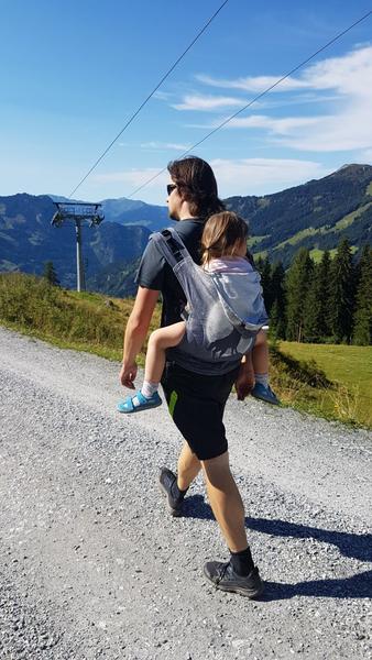 Pokud chceme i neco vic ujit, tak "do terenu" je ideal fakt nositko. Bud krosnove, jak doporucuji holky vyse, ci my pouzivame satkove nositko (na fotce je dcera 4 roky, 20kg, nositko ji uz je trochu mensi, ale nestezoval si ani manzel ani dcera a to jsme toho v Alpach nachodili hodne). Na nem je super skladnost, oproti krosne se da sbalit do batohu ci jej mit okolo pasu a nemit "batuzek" navic, kdyz dcera slape a nenese se.
