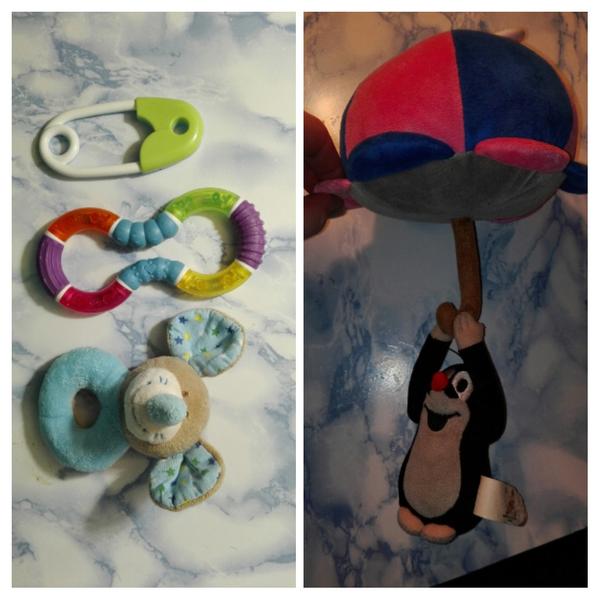 Klíče 🙂, kelímky IKEA, zavírací špendlík. Na začátku Lamaze pejsek.