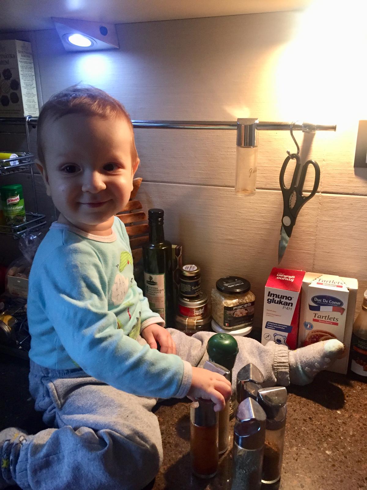 Syn - na fotce 15 mesicu. Chce to kompromis. Staci mu neco zamichat nebo koukat a je spokojeny. Samozrejme kdyz neco smazim, tak jej u sporaku nemam. Myslim, ze mala chce proste pomahat a je to uplne normalni, stejne jako je normalni, ze Ty mas strach, ze si neco udela a chces to rychle sfouknout a nemit ji za zady. Jenze jsi tak starsi a rozumnejsi, tak musis vymyslet kompromis.