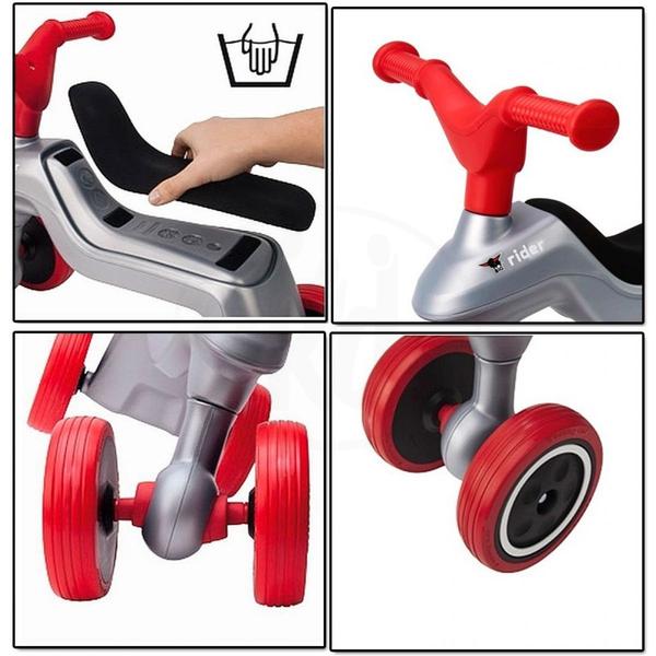 Loni jsme kupovali na jaře motorku, tu menší, bylo mu rok a půl. Jezdí na ní pořád. K Vánocům jsme koupili to koloodrážedlo. Malému je 2,5 roku. Naučil se celkem rychle. Střídá to. Máme GoGoGo, nafukovací kola, s možností zvedání sedla.