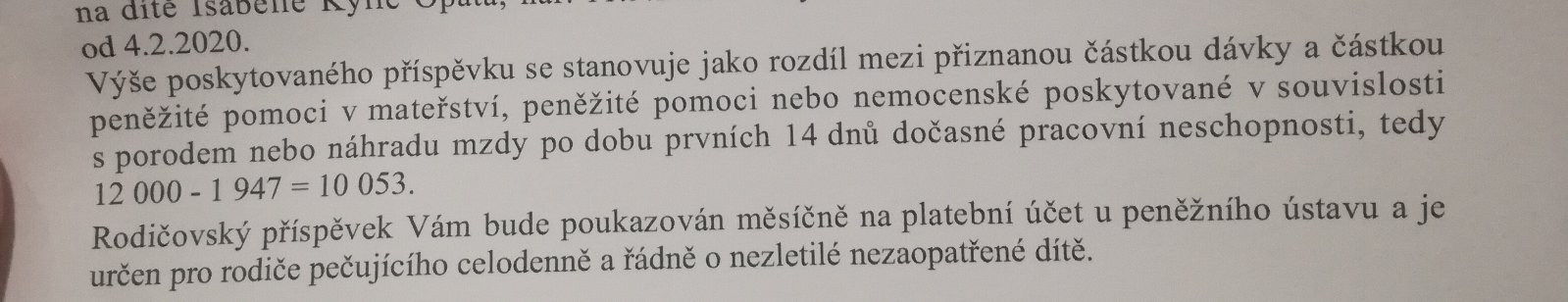 Ahoj holky, dnes mi přišlo oznámení o přiznání rodičovského příspěvku a jsem docela zmatená. Napsala jsem si příspěvek na 25 měsíců, tedy chci pobírat 12 000,- měsíčně, v přiznání mi však odečítají 1947,- a ja nechápu proč. Mateřskou jsem měla v průměru nějakých 20 000,- řekněme. Nechápu, kde je problém. Tušíte, prosím?