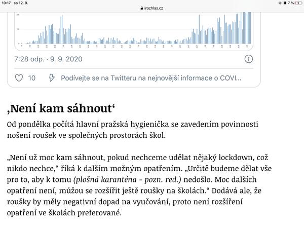 @jelenice_zavodnice vis co, ted uz je tech nemocnych tolik, ze je asi technicky fuk, jestli je jich v Praze 200 podle trvaleho bydliste (jak teda puvodne vsichni rikali) nebo podle testu. Navic je to spicka ledovce. A podil cizincu uz ctvrtinovy az tak neni, jak jsem nekde cetla statistiku. Co mi prislo fakt trapny, ze se treba Nemecky turista vrati domu, je pozitivni a Nemecka! hygiena odhali naprosto neodtrasovane ohnisko v nejakem klubu u nas. A nejde o vyjimky. Nestihaji, nestihaji a nemuzou stihat, ani kdyby se rozkrajeli. Je mi jich lito. Je to totalni selhani statu. (Meli navysit testovaci i trasovaci kapacity. Neudelali pres leto nic. Mista vytvorena, ale nejsou lidi. Pres prazdniny mohli nabrat a zaskolit zalohy. Nic. "CHytra karantena vsechno vyresi a druha vlna nebude. " Druhy vyrok, ktery pristup veleslavne vlady vystihuje je "policisti nebudou pomahat hygienam, budou HLIDAT, ABY LIDI NOSILI ROUSKY".