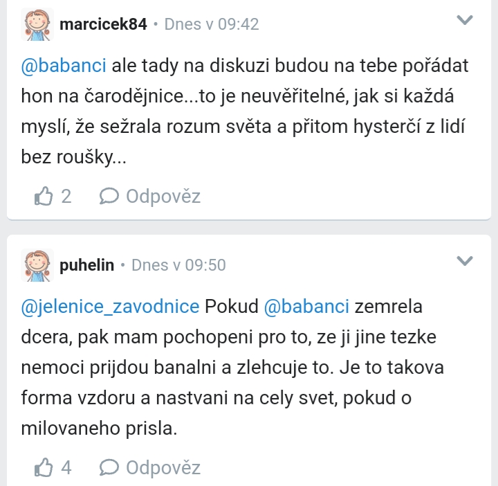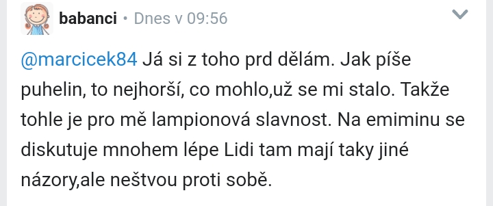 @marcicek84 To piste @alcar Stacilo, aby na to nereagovala, kdyz nebyl duvod. Ja to napsala, babanci mi to potvrdila a alcar se do me pustila. Me z toho nevinte.