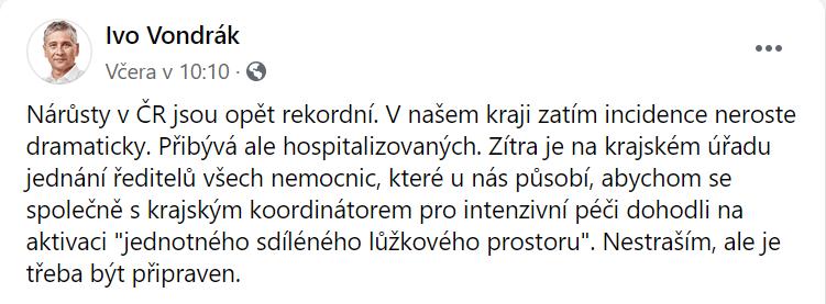 Víš co je zajímavé, že u nás v kraji bílo, ale hejtman se sejde ze všemi řediteli nemocnic aby došlo k aktivaci jednotného sdíleného lůžkového prostoru, to, že někdo v Praze usne na vavřínech nebo s opatřeními 3 týdny čeká, až počasí dovolí (a tím nemyslím zrovna roušky, ale třeba omezení akcí či nočních klubů) a teď dají náhubky děckám do škol je fakt marasmus, ale ti lidé mají známá jména, se divím, že si to necháte líbit a neozvete se, to Ostrava zvládla ukázat krajské hygieně za pár dní a teď každý kmitá jak má.