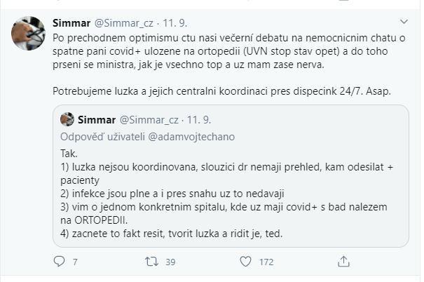 @marcicek84 Ano na jaře se lůžka vytvořila, ale díky lockdownu jich bylo dost prázdných, nepřijímali se ani jiní neakutní pacienti a kolem jednoho Covid pacienta skákalo x-lidí. Teď se, ale děje něco úplně jiného. To tvoje neustálé Praha vs Ostrava fakt nechápu. Ono se to týká celé ČR, jestli to nechápeš. Co si myslíš, že se bude dít, když se v Praze zaplní nemocnice? Řeknou pacientům sorry máme plno a pošlou je domů? Ne, podívají se, kde je volno a šoupnou je tam. Takže pokud máte bílo, tak se snažte si ho udržet, protože se může stát, že v případě, že se to rozjede v Ostravě, tak pro vás ty lůžka už nebudou, možná kvůli Pražákům možná kvůli jiným okresům. Říká se počítej s lepším, ale připravuj se na horší.
