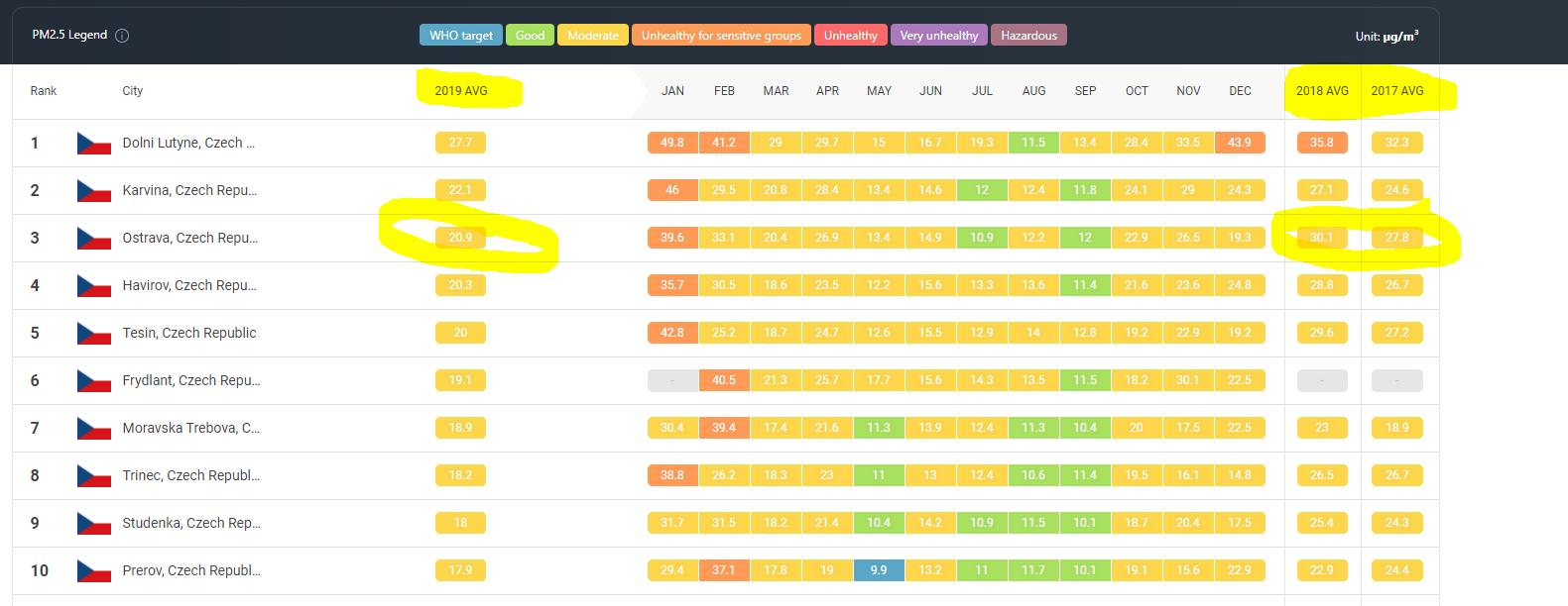 @marcicek84 Ne, to nemám, 2019 byl naopak velmi dobrý rok na kvalitu ovzduší v ČR. Ostrava 2019 průměr 20,9. V roce 2018 to bylo 30,1 a v roce 2017 27,8.
