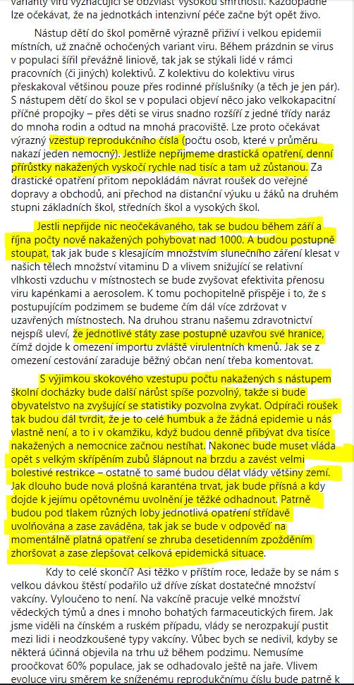 @odula Tak Flegr je vědec zcela pohlcený svým oborem, to je zřejmé hned🙂. Zkusila jsem tedy mrknout na tu jeho srpnovou předpověď a docela mu to vychází. Říkal, že VŠ se neotevřou, hygiena nebude stíhat trasovat, zvýší se reprodukční číslo.... Jinak pro zajímavost mrkni na rozhovor s ním z radiožurnálu. Média ráda dělají ten střet dvou opačných názorů, takže pak tam vypadají jako blázni vlastně všichni🙂. Mám raději, když každý může vyjádřit svůj názor bez té druhé strany. Koukám i na to, co říkají lidé z té druhé strany. Možná ale to jeho vystupování trošku rozpohybovalo vládu, aby začala nějaká opatření dělat, těžko říct.