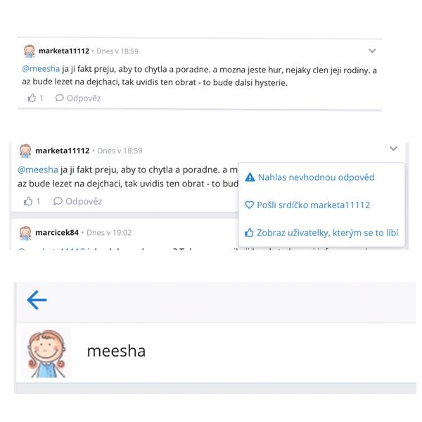 @meesha tak to jsi hrdinka,jelikoz vis cim to bylo vyvolane,Marketa si promazava ty sprostarny co mi tady vcera psala,ale diky @alcar to tady mame,protoze tohle vcera co nam tady psala uz opravdu prekrocilo vsechny unosne meze...