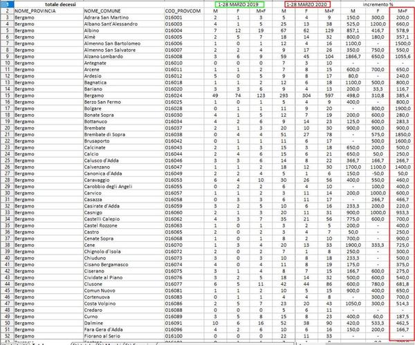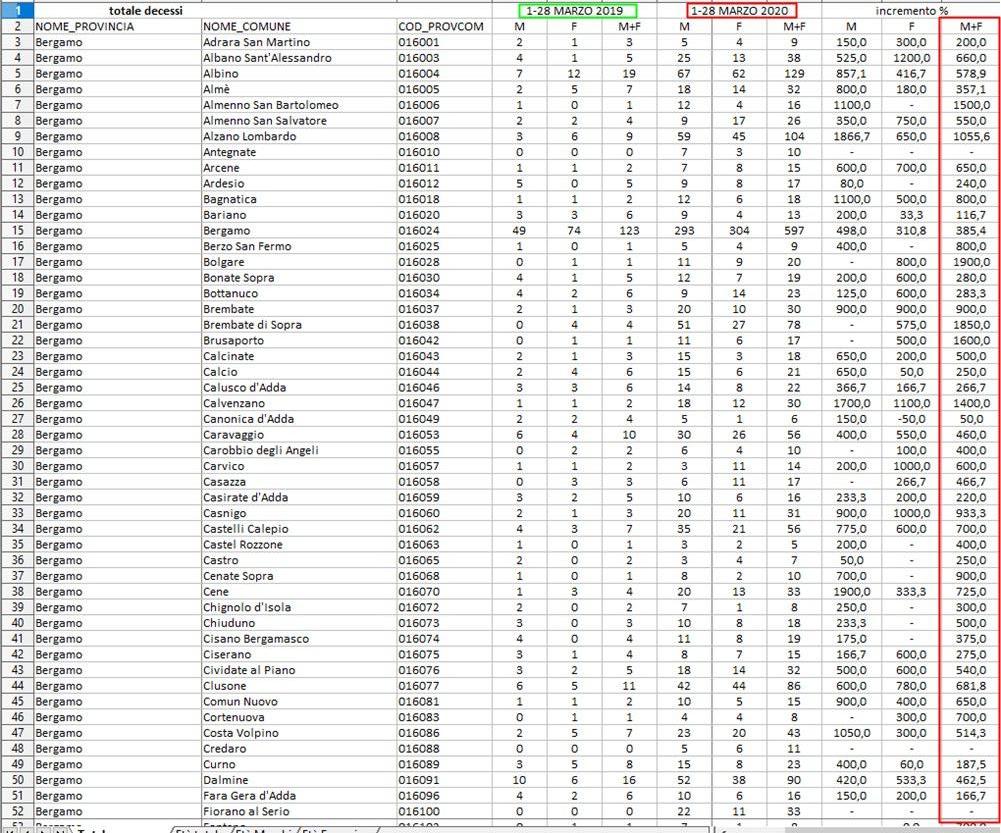 Statistika v Itálii vydala nové srovnání mortality obyvatel v období 1-28. března 2019 s 1-28. březnem 2020. Opět jsem vybral začátek části týkající se oblasti Bergamo a okolí, která byla postižena COVID-19 velmi těžce, a udělal printscreen. Oproti minulému srovnání (1-21. březen) jsou rozdíly mortality dle očekávání ještě větší. Orientace v obrázku není těžká, u jednotlivých obcí máte počty zemřelých lidí (M – muži, F – ženy, M+F – cekové počty) za 1-28. březen 2019 a následně za 1-28. březen 2020. Poslední sloupce jsou procentuální rozdíly (opět M, F, M+F), jistě si povšimnete nárůstu ve většině obcí ve stovkách, případně tisícovkách procent. Kompletní dokument najdete úplně dole mezi soubory na webové adrese https://www.stefajir.cz/dokumenty-covid-19