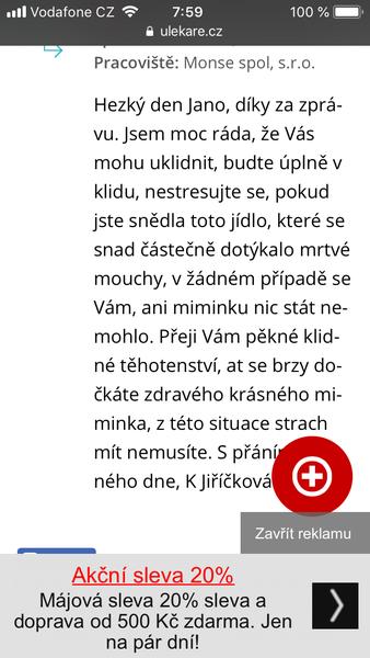 Ahoj holky, stala se mi taková blbá věc..jsem v 17 tt, a dneska jsem snědla asi čtvrtinu z jídla (guláš), ve kterém byla mrtvá moucha 😔 co se může stát? Asi trochu hysterčím co? Ale já se musela zeptat 😁 děkuju 😘