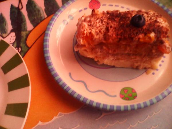 Tak jsem se pustila do svého prvního studeného sladkého dortu (zakysanka, piškoty, kompot mandarinky, ananas, banány, vanilk. puding) a prvního slaného dortu s česn.majon. pomazánkou.