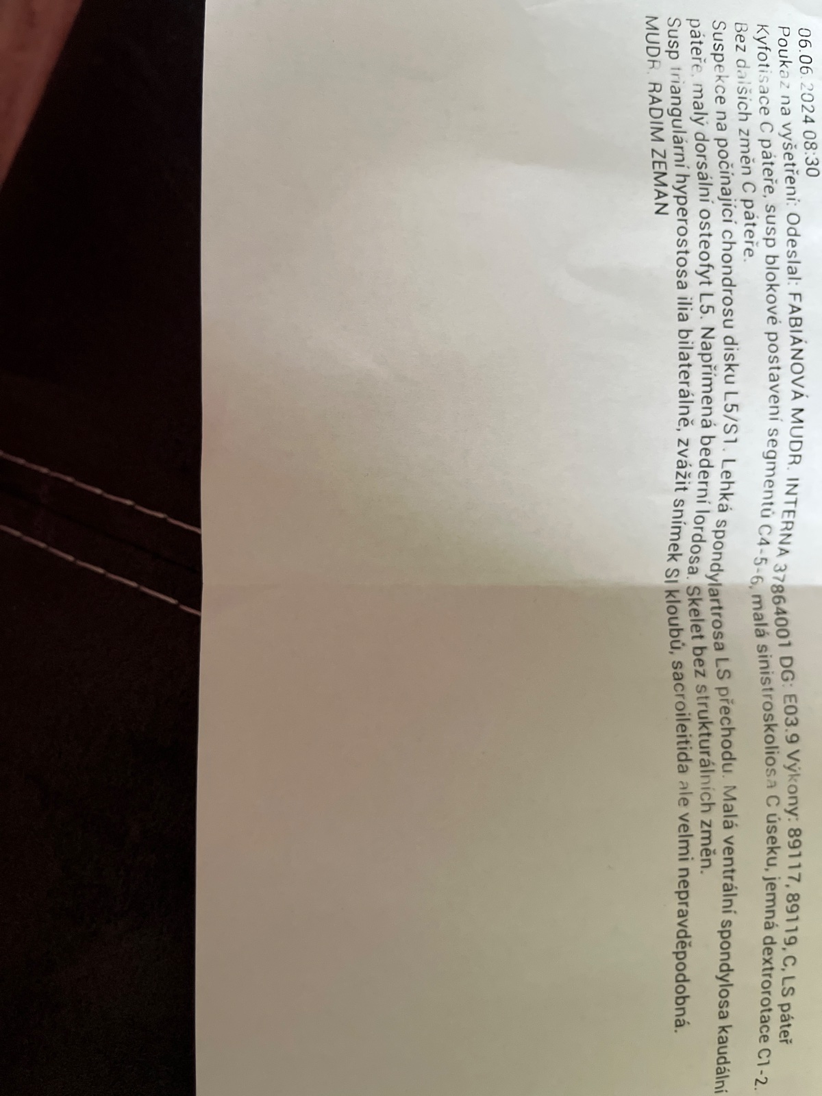 Hele, ta vyfocená zpráva lajcky řečeno říká: "svalově je úplně v pytli, po celé ploše zad, ale zatím je to problém měkkých tkání, mělo by to jít rozcvičit a s trochou péče a pravidelného cvičení fixovat do správných poloh".