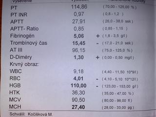 podla tej tabulky co tu dala denisocka tak ja mam vsetky hodnoty dobre len ten D-dimer mam vyssi, teda to nie je az tak zle, dufam
