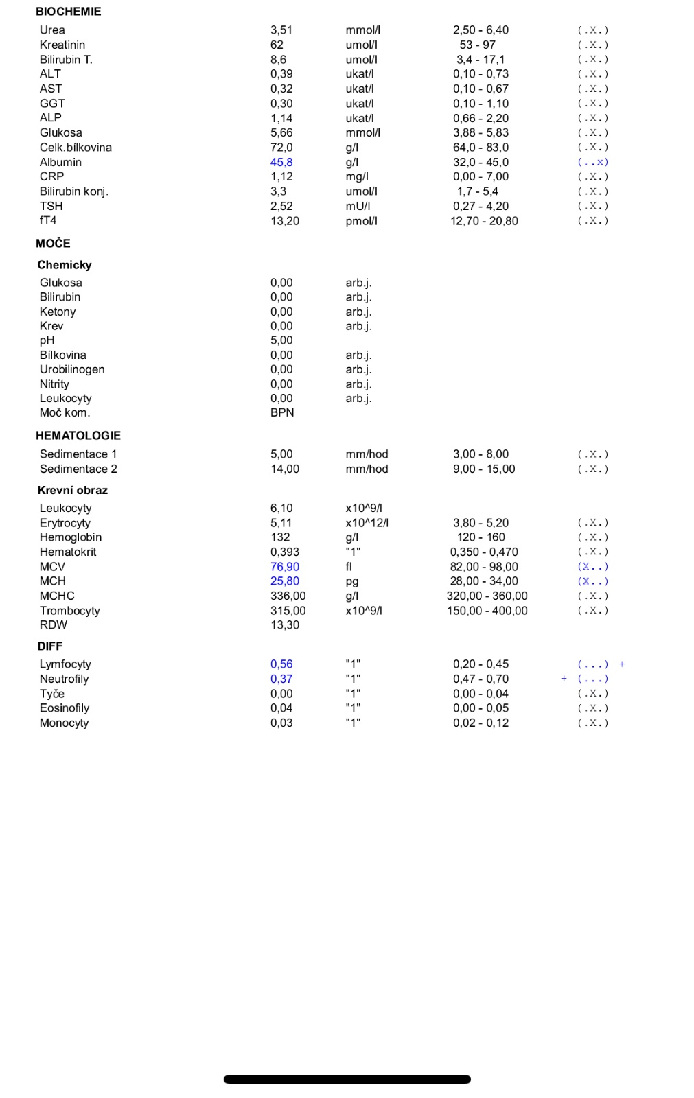 Já jsem původně laborantka. Z těch výsledků není potřeba se bát, nejsou to nějaké šílené hodnoty. Předpokládala bych že si je Dr. Jen ohlídá příp. pošle na hematologii na doplňující vyšetření. Takže buď v klidu, tohle nejsou výsledky k strachu či panice. Většinu výsledků máš v normě. Příp. Lehce nad/pod referenční hodnotou dané laboratoře. Výsledky krve jsou ovlivňovány stravou či aktuálním zdr. stavem např rýmou i fyzickou aktivitou před odběry. Fakt klid.