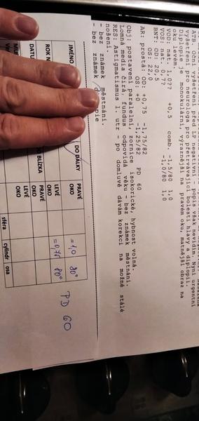 Klid, kup si brýle 😉 pokud máš u dioptrií stupně, je to astigmatismus. Pokud je 1 a 0,75, fakt už potřebuješ korekci. PD je šířka mezi zorničkama. Ten záznam z vyšetření máš přímo předepsanou korekci nebo jen hodnoty měřené autorefraktometrem?