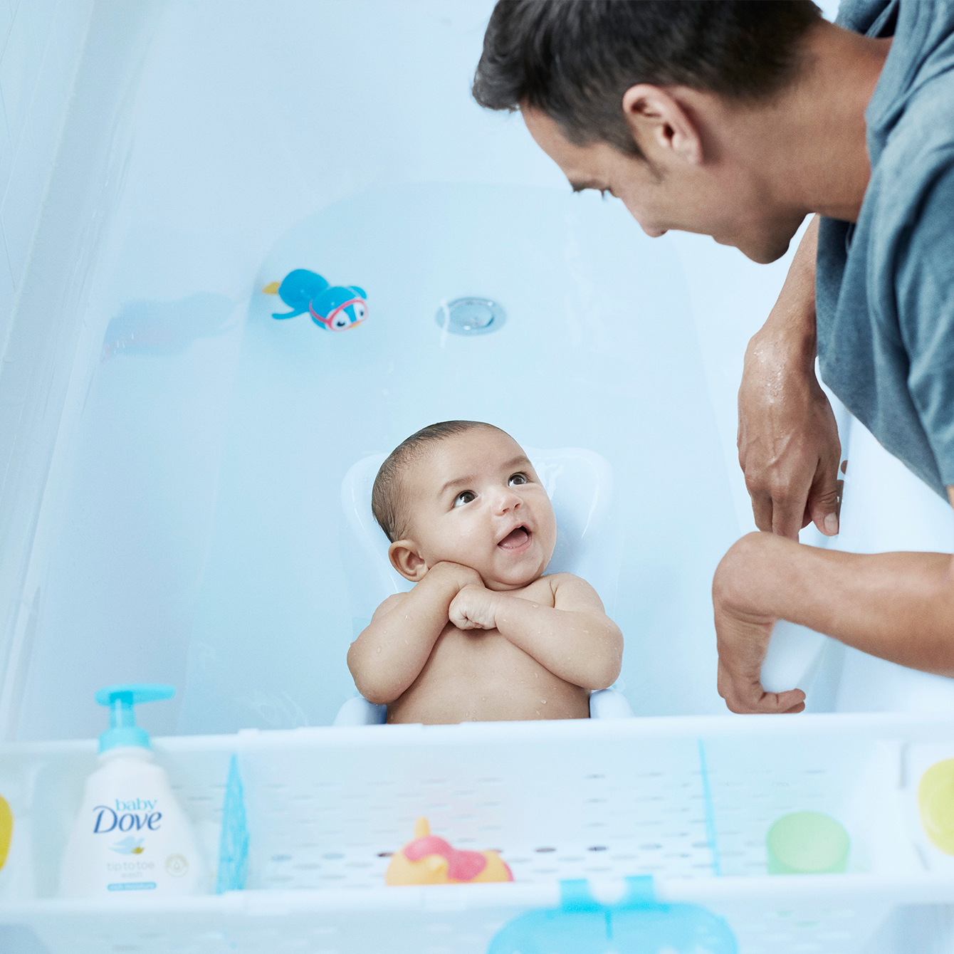 Při koupeli tělíčko a hlavičku navlhčete teplou vodou a naneste Baby Dove Mycí gel na celé tělo i vlásky. Všechnu pěnu poté důkladně opláchněte rukou anebo mycím hadříkem. Po koupání miminko jemně osušte a pro ještě lepší hydrataci a vláčnost můžete nanést Baby Dove tělové mléko.