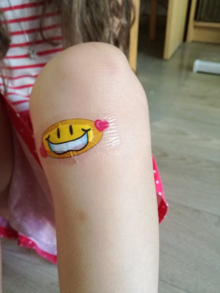 Dceři se natolik smajlíci zalíbily, že si musela hned pro jistotu vylepit dalšího, tentokrát na ruku i přesto, že tam žádné bebíno neměla. Rozhodla jsem se, že otestujeme, co taková náplast vydrží a když se ani po třech dnech nejevil nejmenší náznak toho, že by se chtěla sama odlepit, musela jsme ji sloupnout ručně. Avšak další, co mě překvapilo bylo, jak lehce šla sundat a ani to nebolelo. Nemusela jsem ji silou páčit, jako jsme zvyklé u konkurenčních značek, že děti doslova řvou, jak je lepení bolí. Navíc mladší dcera má na téměř všechny náplasti dostupné na trhu alergickou reakci, takže musíme opravdu pečlivě vybírat a to se nám s náplastmi Spofaplast nestalo ani jednou.