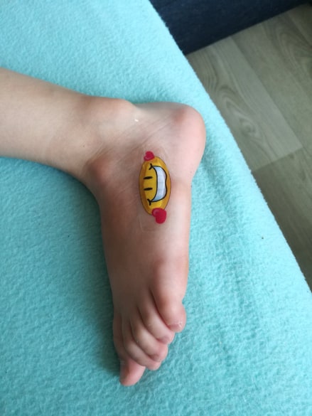 Jako první byla otestována smajlíková náplast. Dcera si odřela v sandále bok nártu a měla mít vystoupení na školní akademii v balerínách. Sice by se na tuto příležitost hodila víc neviditelná náplast, ale nechala jsem to na ní 🙂 Náplast pěkně držela, i když byla v balerínách naboso, vydržela i koupání ve vaně a druhý den v bazénu. Pak ji dcera sama sundala bez bolesti a slz, šla dolů pěkně.