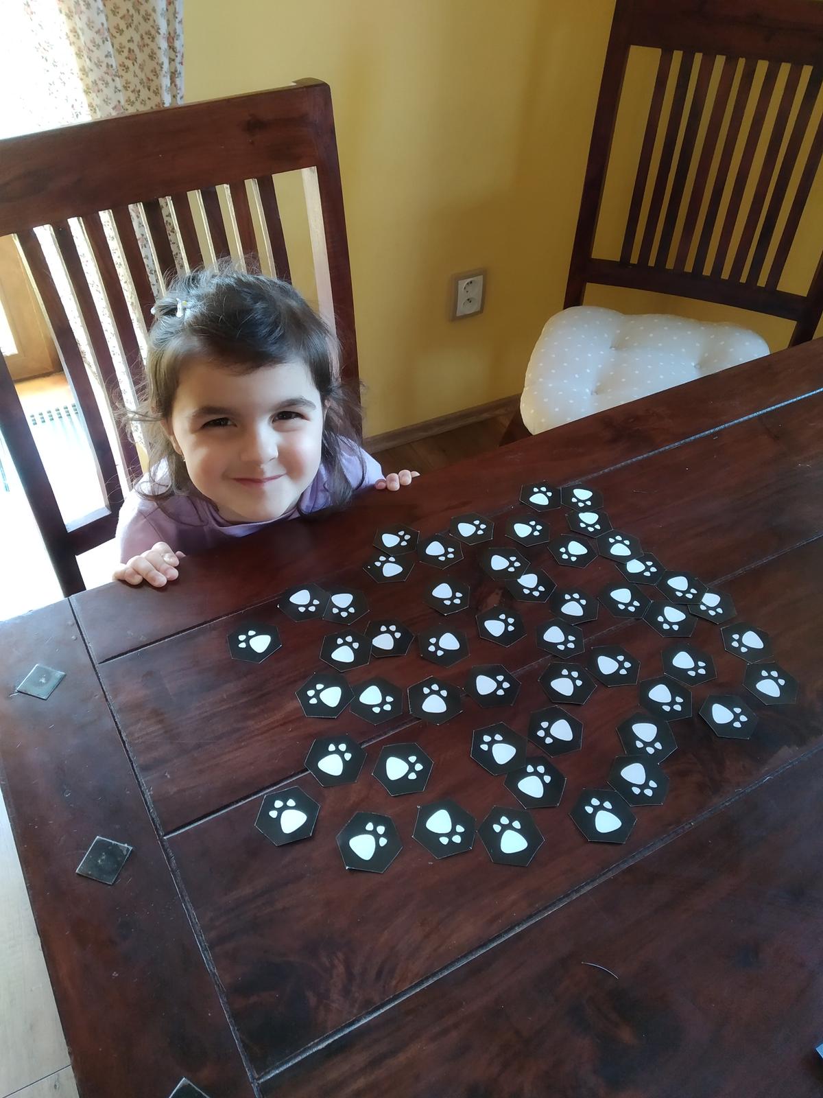 Toto je jediná věc, která mě nenadchla. Je super, že si můžeme vystřihnout krabičku, tak se nám pexeso nikde nepoztrácí. Jinak mě trochu zklamal materiál. Pexeso má šestihranný tvar, stříhání tedy nic moc. A papír má tendenci se při hraní ohýbat. Nevím, kolik to vydrží, než se rozbije. Ale i přesto Terezku moc baví. Takže účel určitě splní.