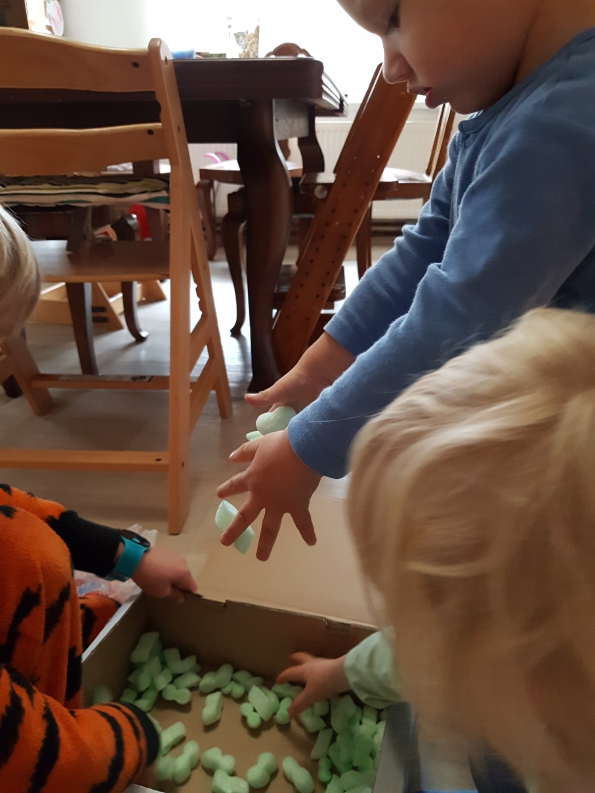 Balíček se nakonec o týden pozdržel, ale dorazil. Jeho rozbalení jsem nechala na děti. Po snídani, ještě v pyžamech, se na to vrhly. Rády objevují tajemství balíčku a to nejen výrobky Somat, ale milují výplně balíčku, takže zelený mašličkový polystyrén rázem pokryl celou kuchyni (že jim vůbec pořizujeme hračky?!?!). Nic nezkazil ani fakt, že jeden gel trošičku vytekl (asi se nějak pootevřel, protože lahev praskla nebyla).
