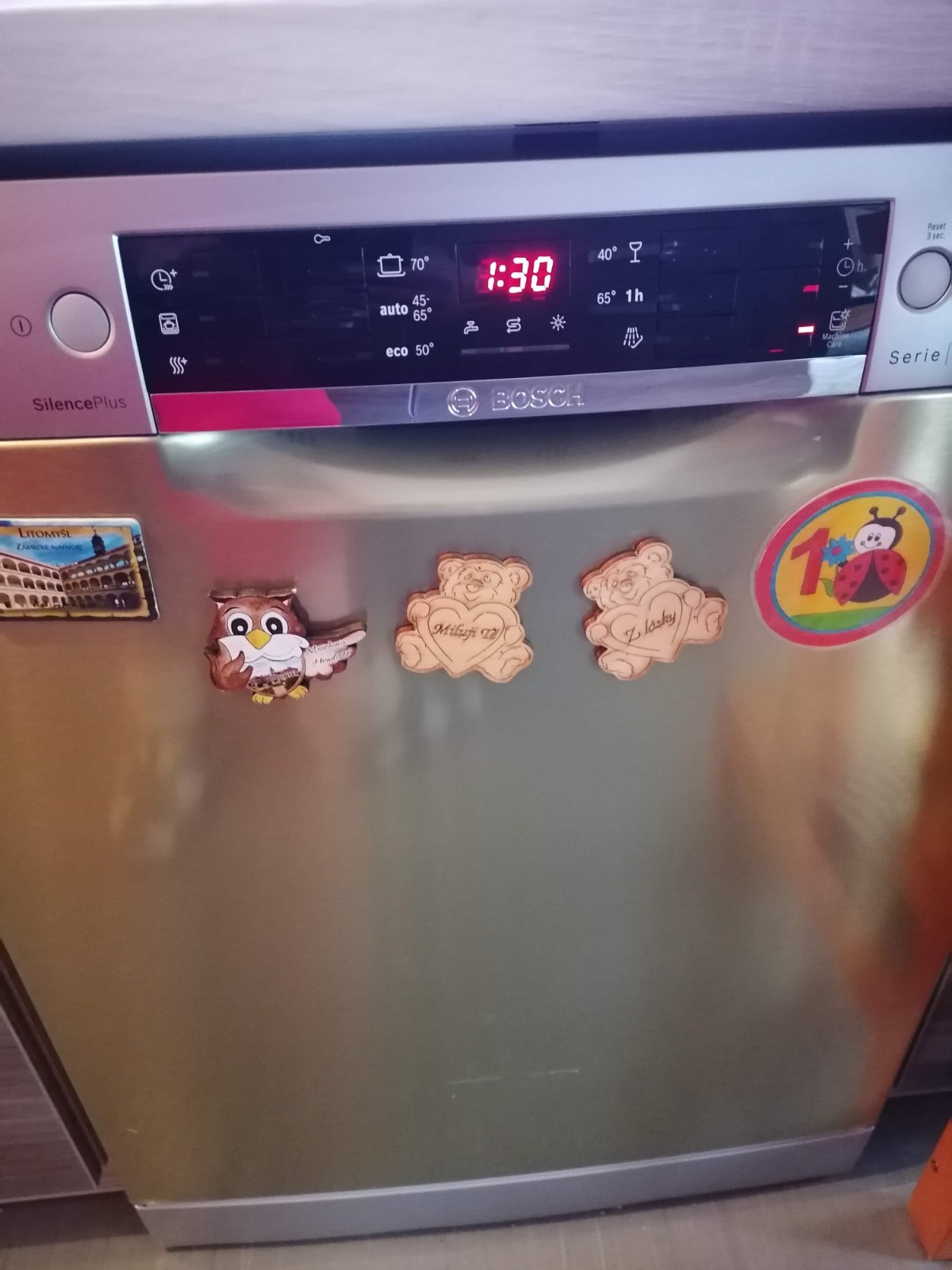 Vyzkoušela jsem také oba čistící prostředky. Neutrální pocit mám z čistící tablety, která se dává do myčky spolu s nádobím. Myčka vypadala po umytí úplně stejně, jako když tam ta tableta není. Zklamaná jsem ale byla z čistícího prostředku. Ten se používá samotný. Má vyčistit filtr. Nastavila jsem myčku na 65 ºC a filtr zbavila mechanických nečistot (zbytků jídla apod.). Ale po skončení programu byl filtr stejně mastný jako před tím. Takže v tomto ohledu to jistí i nadále ruční mytí.