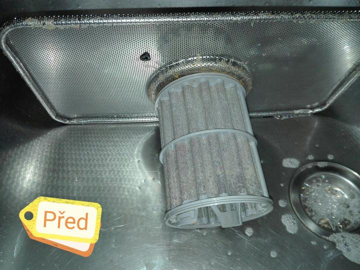 Po vyjmutí spodního filtru jsem zjistila že je pořád mastný tak jsem ho umyla v ruce a sledovala po dobu testování.