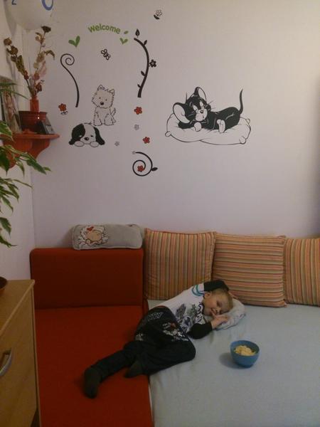 Obrázky/nálepky jsem si vyráběla sama a za postel jsem původně chtěla taky nálepky, ale nakonec, jak jsem viděla malého, jak se tulí k té studené zdi, jsem ušila kapsář.