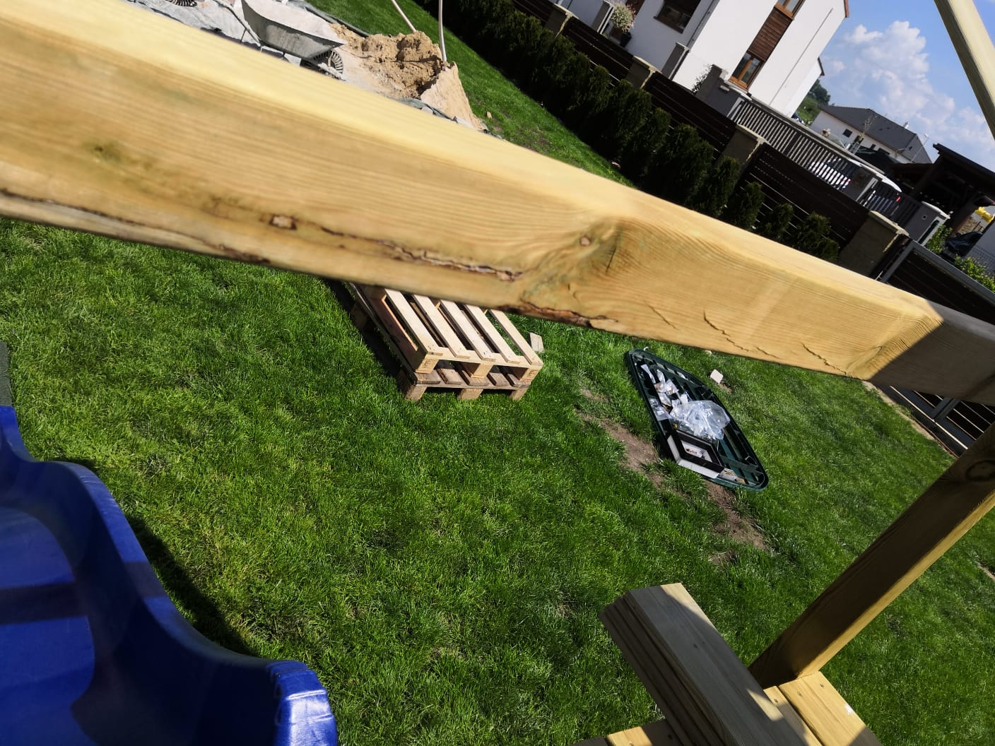 Tak jsem si právě převzala zásilku pán ochotný zavezl mi to kam jsem potřebovala, dřevo vypadá taky dobře žádné praskliny ani plíseň. Teď nedokáži říct jestli chybí nějaký kousek dřeva, ale vypadá to dobře, hned jsem vyskládala do altánu na prkýnka, aby to pořádně proschlo a těším se až budeme natírat a skládat 🙂 Potom vyfotím hotové hřišťátko 🙂