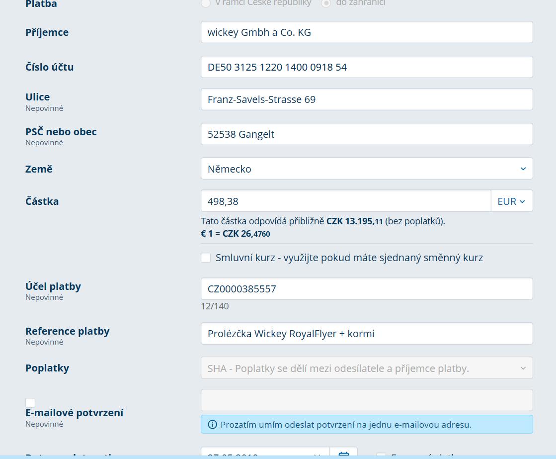 Hezký den, do e-mailu mi přišlo potvrzení objednávky a to obsahovalo údaje k platbě. Zadávala jsem jako zahraniční odchozí úhradu v korunách, což bylo i tučně zvýrazněno v e-mailu s podklady k platbě.