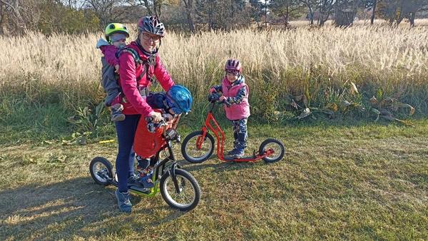 Pětiletý má koloběžku svoji a já druhou a před sebe jen postavím tříleťáka. Jezdíme tak do školky běžně.