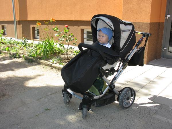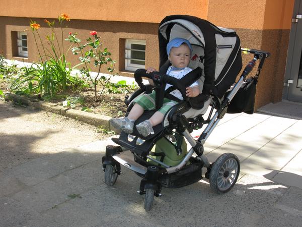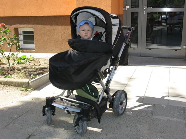 A tady jen sporťák s dítkem po směru jízdy a hrátky s nánožníkem. Můžete si všimnout, že v sedě je kolem těla dítěte trochu více obepnutý. Jednou je to nánožník ve zkrácené verzi použit bez madla a s opěrkou nohou v rovině a podruhé je to v prodloužené verzi i s madlem a opěrkou na nohy visící dolů. Je to focené bez fusaku bez deky, takže ten nánožník úplně nedrží tvar. Pozorní si mohou všimnout opět dvou malých slonů vedle Matoušovy hlavy.