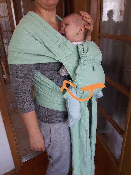Pořád vidím, že má špatně nožičky. Já u tohohle nosítka třeba vůbec neřešila výšku, ale šířku mezi nohama. Kolínka musí mít výš než prdelku, a to při tomto úvazu nemá.