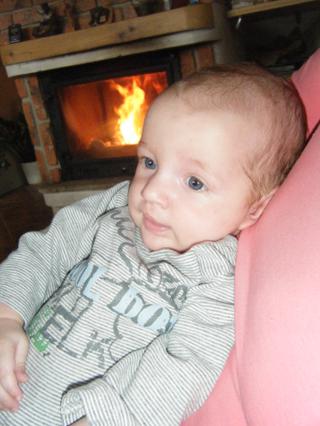 zase nějaké foto : relax u krbíku-Bruno s babičkou, výtuh dopoledne na matraci v obýváku-Bořek a velký údiv obou chlapečků