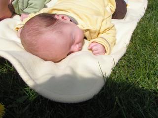 Sarri, většinou je mám naležato, protože chrní, ale když jsou vzůru, tak jim to trochu přizvednu, aby taky něco měly ze světa. Nezvedám je moc, o sedu nemůže být řeč, pořád mají opřenou hlavičku, spíš takový pololeh, myslím, že to nevadí. V autosedačce taky prakticky sedí a nevadí to.