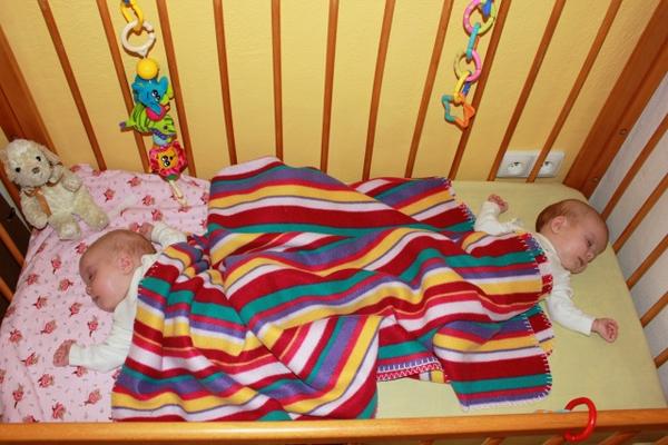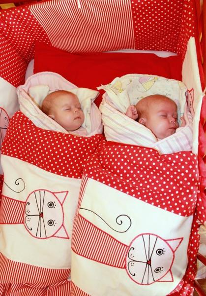 @barusmackova tady máš slíbené fotky jak holky spí... fotka s povlečením kočičky ... v těchto polohách spí přes noc..... kde jsou přikryté jen dekou tak takto spí přes den dole v obýváku... takže v pohodě to jde. Naše holky mají 3měs. a stále spí spolu ,-)