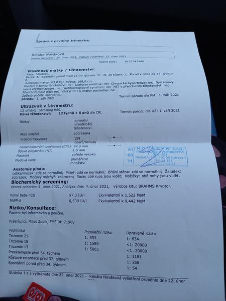 @nikishkaaaa ano, když jsme přišli na genetiku, tak tam doktor říkal, že mám jen jeden ukazatel špatný a zbytek normální. a že když bych měla hormon placenty nula, tak by už moje dítě bylo dávno mrtvý, a že je to určitě chyba laboratoře. Sám nám podle výsledků vyhodnotil riziko 0,1 %. Nicméně nám nabídnul odběr choria, a nebo (to tehdy byla novinka!!!) prenascan. Neinvazivní krevní test na 3 nejčastější vady, který stál 15tisíc, dělal se pouze v gennetu a krev se posílala do Hong Kongu. Jelikož riziko toho, že se stane něco při odběru choriových klků byla vyšší než to, že máme postižené dítě, rozhodli jsme se pro neinvazivní krevní test. Vyšel pozitivní na downův syndrom. Vzhledem k tomu, že to byl nový test, musela jsem stejně ještě na odběr plodové vody, která trizomii potvrdila.