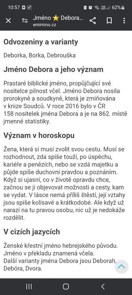 A ja nemuzu rict o zadnem jmenu, ze se mi nelíbí . Kazde jmeno ma to své . Jak se rika....kazde jmeno je krásné,kdyz se krásně rika. A Deborka je krásné jmeno.