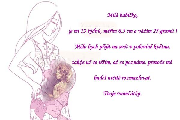 No ja jsem ve 12. tydnu a uz mi zacina brisko rust. Pred tehotenstvi jsem brisko nemela vubec, tak ted uz je vystouple. A nesmim si vzit uple, jinak to jde videt. Jinak my oznamovali rodicum losem a zbytek rodiny bude na vanoce. S kazdou stranou se sejdeme u babicky. Delam pro babicky kalendare, kde budou zaznacene narozeniny vsech v rodine. A kazda rodina bude mit fotky u jednoho urciteho mesice. No a v jednom mesici bude fotka z ultrazvuku a k tomu nejake povidani.