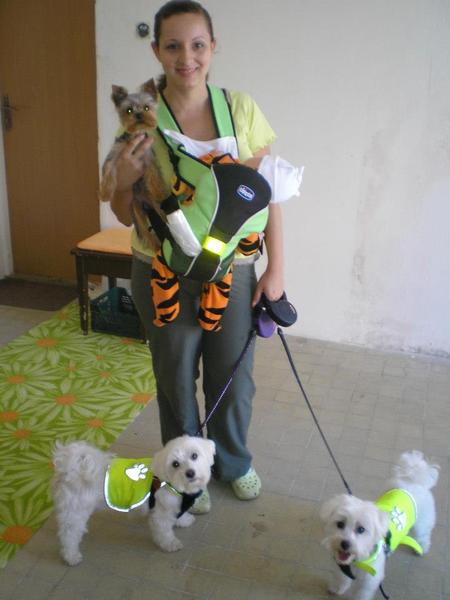Po narození malé to chodí tak, že ráno, odpoledne venčí manžel. Po obědě venčím buď s kočárkem a malá spí nebo spí v postýlce a venčím kolem baráku (bydlíme v přízemí a slyším, jestli se nevzbudila...) a večer spíš manžel, někdy já. Každý den jsme si našli čas a střídavě se věnovali i jen pejskům. Když malá spala, tak jsme se mazlili, když byla vzůru, tak si ji vzal manžel, já byla se psy a pak naopak. Od té doby, co malá chodí, tak venčívám i s malou a v pohodě. Jsme sehraní, když jdeme přes cestu, tak pod jednu paži drapnu dcerku a pod druhou Matýska a maltézáčci na vodítku. Když byla dcerka ještě malinká, tak jsem ji dala do nosítka na břicho, vzala pejsky a šli jsme na procházku do polí. Když už se tam nevešla, tak chodíváme i s manželem. Dvě vodítka, tři psy a kočár už bych na procházku nezvládla, ale párkrát jsem tak taky venčila. Teď má před Vánoci mažel zase spoustu práce, takže odpoledne odjede, vrátí se dopoledne, pár hodin se vyspí a zase jede. Vše je na mě samotné a zvládáme taky. Ale co se setkáváme s názory, tak hodně lidí by to nezvládlo natož s nemocnými psy...