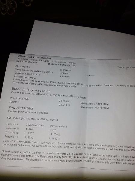 Ahoj holky,muzu se taky k vam pridat s dotazem? Minuly tyden jsem byla na NT screeningu v Brne Prenatalu ve 12+2 tt,celkovy vysledek negativni,ale v sede zone. Mam prijit na konlni ultrazvuk a genetickou konzultaci,tady je vysledek: Paap-a-1,23 MoM, hcg 1,4 MoM, NT 2,0mm, nosni kustka drobnejsi,jinak vse v poradku dle UTZ,riziko dle veku 1:651, kombinovane ziziko M.Down 1:776. Je tu nekdo s podobnym vysledkem a narodilo se mu zdrave mimi? Nevim proc me zenou hned i na genetickou konzultaci,navic mam jit k dr.Leznarove,po tom,co jsem tady na ni cetla,z toho nejsem nadsena.