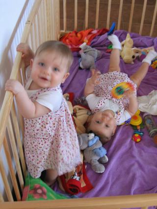 Holky, tak to já se vám musím taky pochlubit, Elenka už taky stojí, už skoro měsíc. Teď to dopilovala tak, že se drží už jen jednou ručkou a začíná obcházet postýlku nebo ohrádku... 😉. Aničce se nechce nic moc, ona lozí po čtyřech, ale ještě nesedí, vypadá to, že bude dří v stát než sedět... Tohle je stojící Elenka. A jinak přidávám fota, jak nám holky dokázaly usnout.... Nejdřív Anička, pak Elenka.