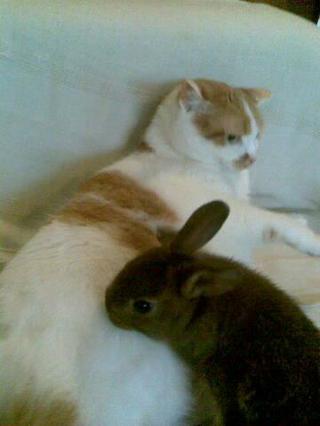 no kočka moc pohodářka není. Tím, že tu byla tak dlouho jako jediný mazlík (nepočítám malou), tak dost trpí a je občas zmatená..no a králíkovi je jedno, ke komu se tulí a jestli se to kočce líbí nebo ne. Ale už spolu i spali stulení na gauči - králík schovaný kočce pod ocasem..a dokonce jednou hledal na břiše cecíky, to byla fakt sranda 😀