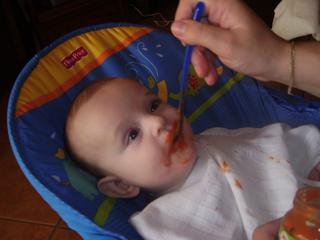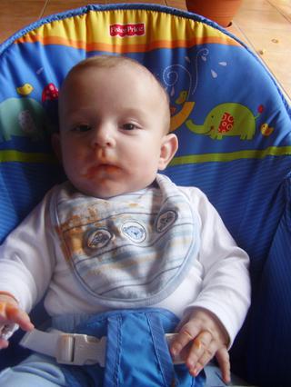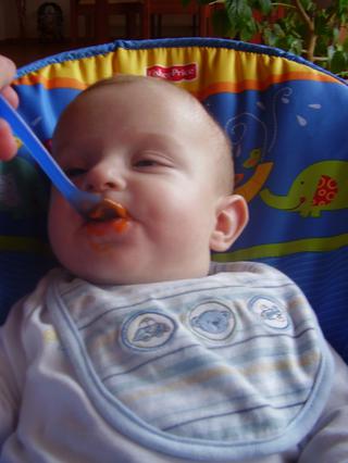 No jinak se musím pochlubit,byli jsme v pátek na převážení, protože jsem si nebyla jistá s těma kašičkama, a jak jsem teda na tom s mlíkem,a měla jsem strach aby prcek nestrádal, tak má 6970g 🙂 a všechno to co se dělo souviselo se zoubkem. Už líp spinká, akorát pořád strašně slintá, asi půjde i druhej zoubek na řadu. No ale dr mi říkala, ať kašenedávám, a začnu pomalu se zeleninkou, takže v pátek dostal Lukýnek první mrkvičku...jak to dopadlo znázorní přiložené fotky 😀 No chutnala mu moc 🙂