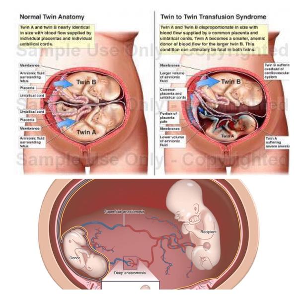 Jinak tady jeste zaznelo, jestli je rizikovejsi mono-mono nebo mono-bi. Kazdy typ ma sva uskali. Typ mo-bi ma horsi prubeh TTTs, vzhledem k dvema plodovym obalum, kdy dochazi k nepomeru v mnozstvi plodove vody. Kdyz to reknu laicky, tak prijemce si od darce vytahne plodovou vodu a darci, treba v pripade 3.st, nezbyde vubec zadna (plodovy obal je na plodu doslova prilepen, dochazi k selhani ledvin) a prijemce je pretizen, zvetsuje se mu srdce, zacinaji otoky atd. Krome toho se obiraji take o krev. Darce je anemicky a prijemce ma pretizeny krevni obeh.