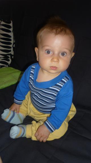 Samuelkovi je pul roku, uz papame prikrmy a ucime se sedet ...Pridavam foto sediciho Sama! Je to nejvetsi milacek, strasne hodnej .. myslim, ze si rekl, ze mi vynahradi to ne uplne dobre tehotenstvi!